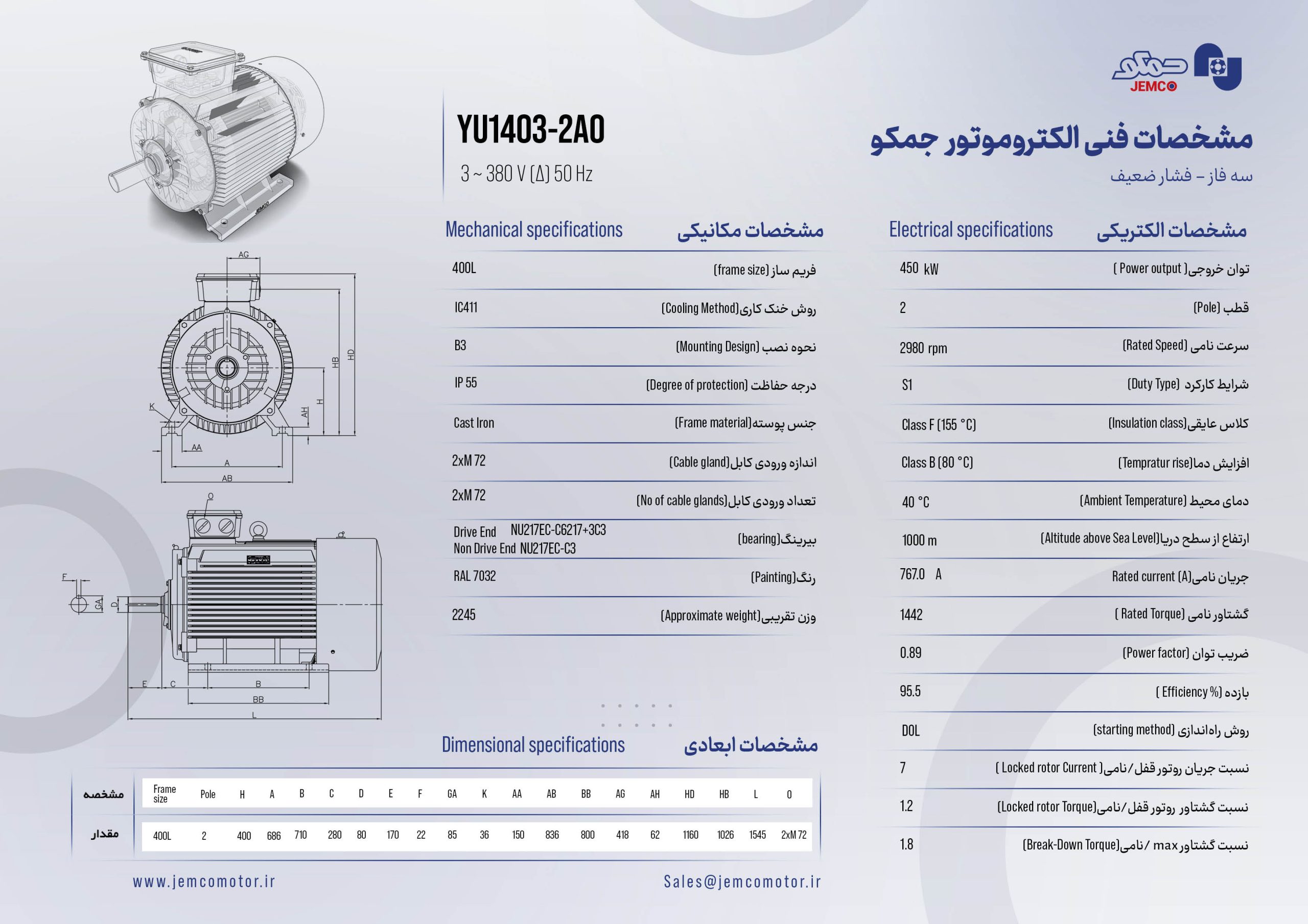الکتروموتور سه فاز جمکو با توان 612 اسب بخار( 450 کیلووات) و سرعت نامی 3000 دور در دقیقه (2 قطب) از نوع القایی بوده و با پوسته چدنی مطابق استاندارد بین‌المللی IEC تولید می‌شود. این محصول با طراحی مقاوم، راندمان بالا و طول عمر زیاد، برای استفاده در محیط‌های صنعتی و کارکردهای سنگین ایده‌آل است.
